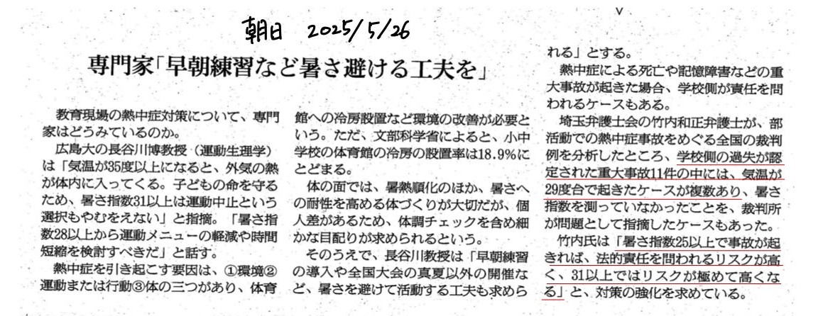 5月26日、朝日新聞の熱中症特集から。特に赤線の部分。「暑さ指数31(危険)まで、外活動は大丈夫」と考えていらっしゃる皆さまへ。未就学児よりも体温調節機能が働き、体力もある児童、学生の話でも、これです。